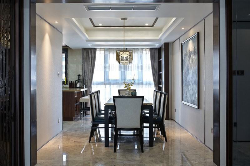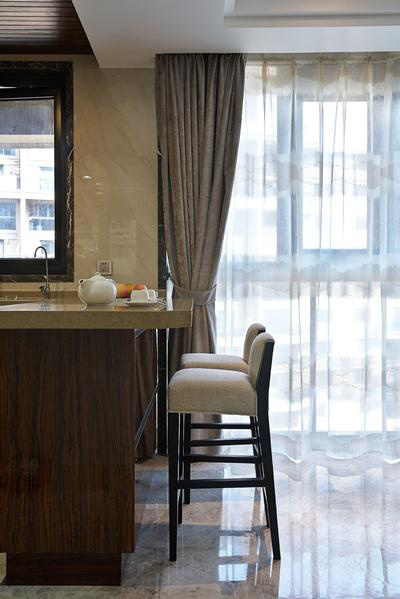 中式风格的装修给人一种优雅的感觉,黑色的传统中式家具看着很大方,大理石的地板砖用其天然的质地给人一种大气的感觉。这套中式风格的住宅能给人一种明亮宽敞的感觉,主要是因为客厅内大面积的落地窗,巨大的落地窗让阳光无阻碍的照射进来,与白色的大理石地板砖相互映衬,从而让室内可以明亮通透。同时,黑色的中式风格装修家具很严谨,给人一种独特的东方风韵。