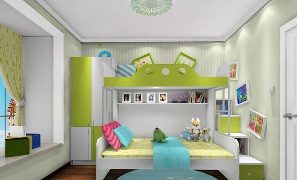 将嫩绿色的高低船,不仅使整个房间变得简约、干净,而且还增加了房间的储物空间。嫩绿色的墙纸、窗帘和衣柜、置物架,异常协调,让整个房间都显得清新明亮,无形中还起到了增大房间面积的效果。高低床和置物架的造型时尚,现代感十足,这样的设计,还大大地节省了空间。