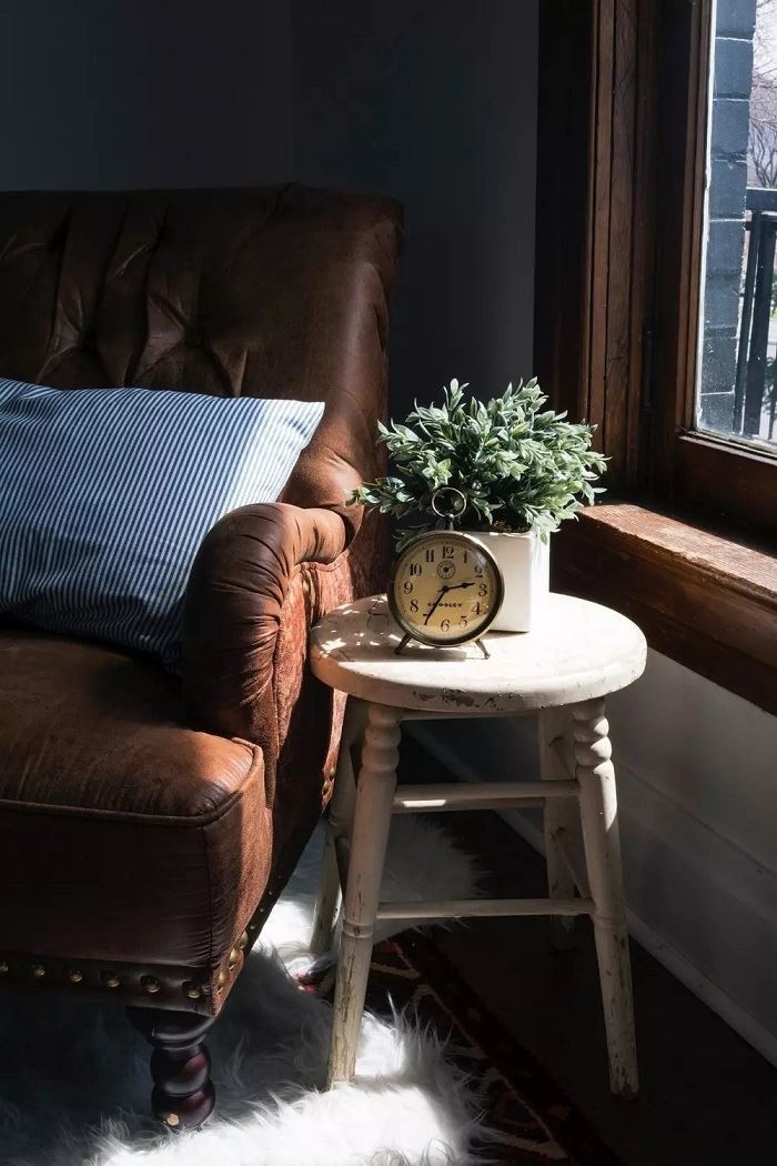 又是一组怀旧风设计,皮质沙发、做旧的桌子、复古钟表这些元素,被毛绒地毯撞了一脸温柔。
