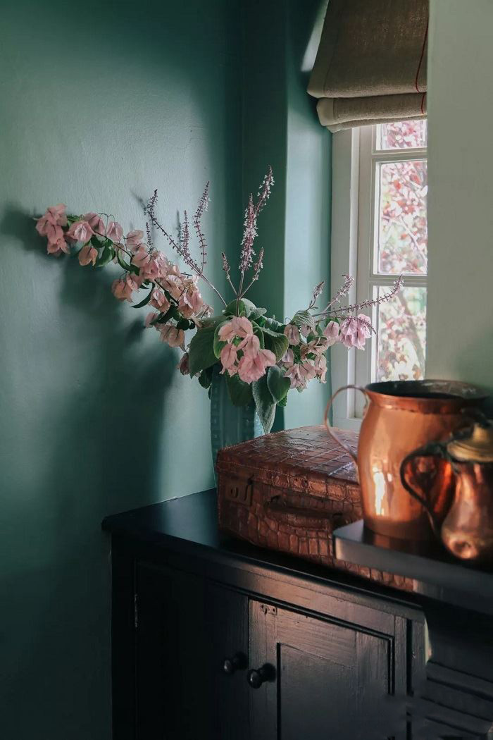 浓浓的怀旧复古风装修风格,蛇皮行李箱与黑漆柜子巧妙结合,一瓶淡雅的花让整个宁静的空间活泼了起来。