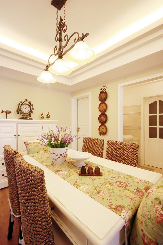 田园碎花的墙纸也成了我们客厅区的点缀,藤制+碎花布艺餐椅,餐桌上的一束花,餐边柜上花环造型的时钟,构成了我们的田园温馨美家。