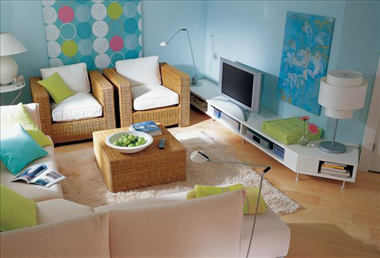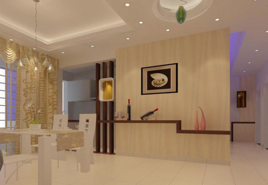 1.刷涂料:对墙壁进行面层处理,用腻子找平,打磨光滑、平整后刷涂料,主要是乳胶漆。墙的上部与顶面交接处用石膏线(或木线条)做装饰线,下部与地面交接处用踢脚线收口。这是对墙壁最简单也是最普遍的装修方式。这种处理简洁明快,房间显得宽敞明亮,但缺少变化。可以通过悬挂画框、照片、壁毯等,配以射灯打光,进行点缀。现在还有一些新型的涂料,如仿丝绸涂料、多彩涂料等,使墙面处理手段更加丰富。