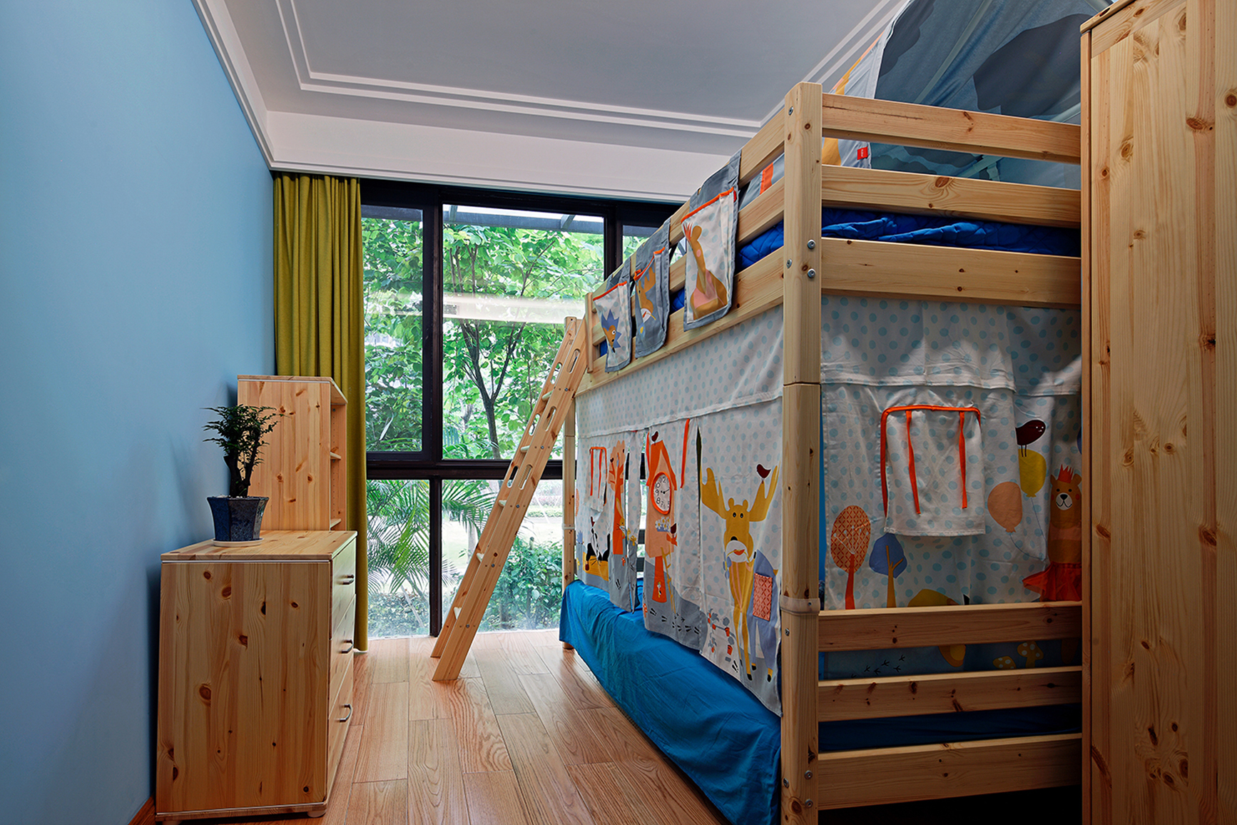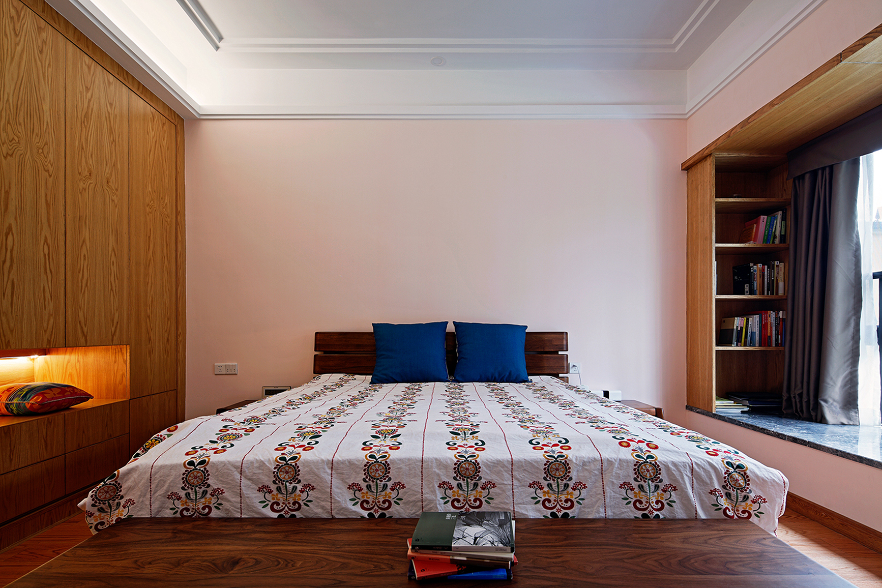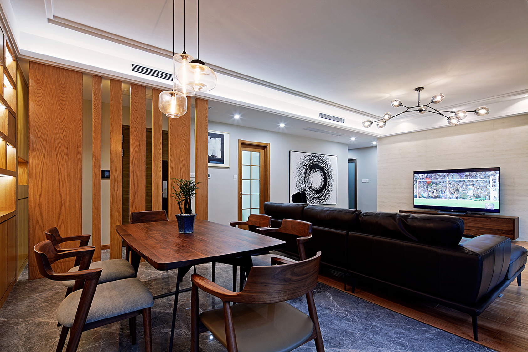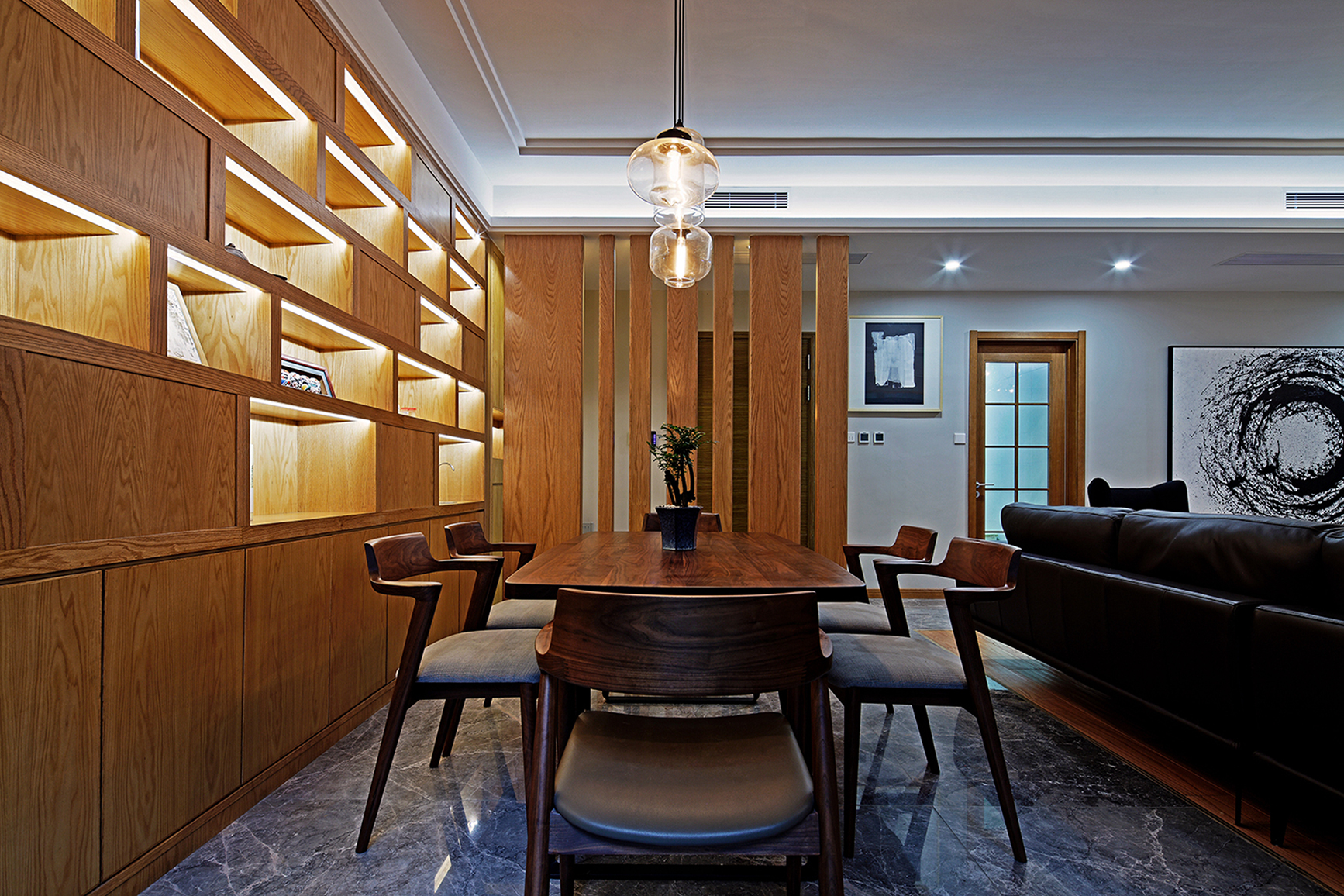 以深浅不一的原木家具贯整个住宅空间,搭配裸白色墙面,整个空间给人的感觉清新而舒畅。