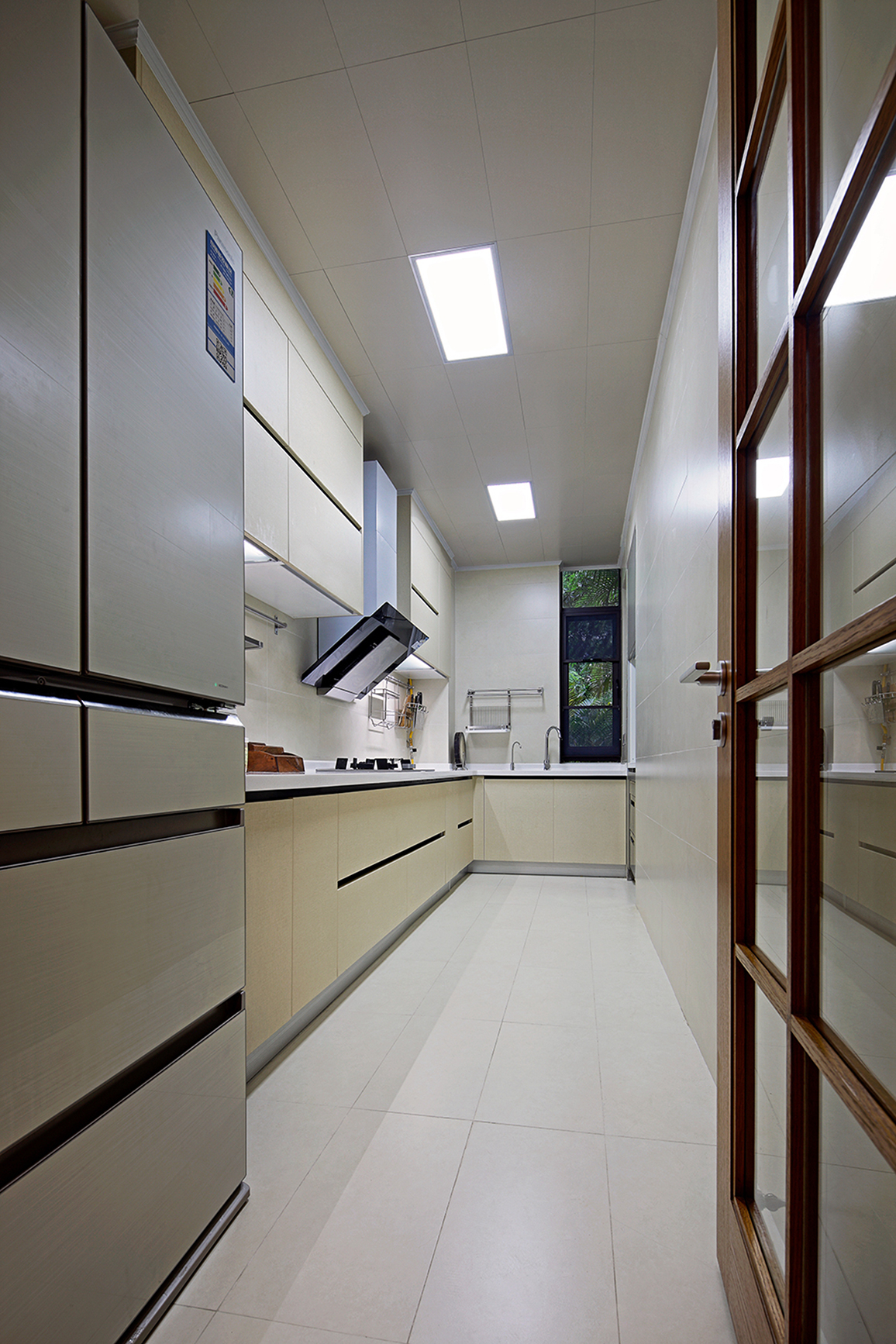 整个空间以白色为基调,搭配暖黄色实木家具,让环境多了几分温情,给人以之感舒适之感。同时穿插小白方砖墙面铺设,结合绿意盎然的植物,营造出清爽洁净的视觉感受。