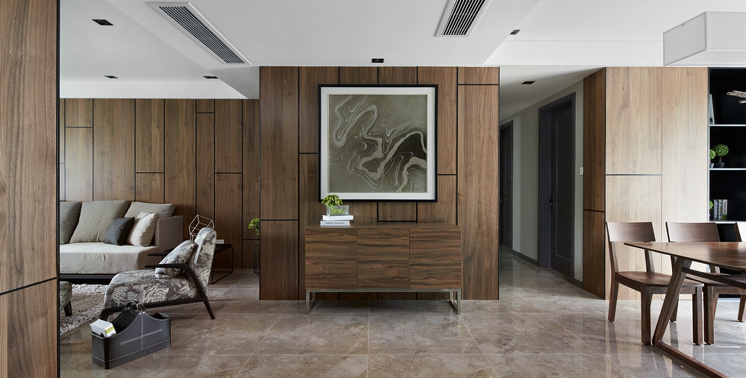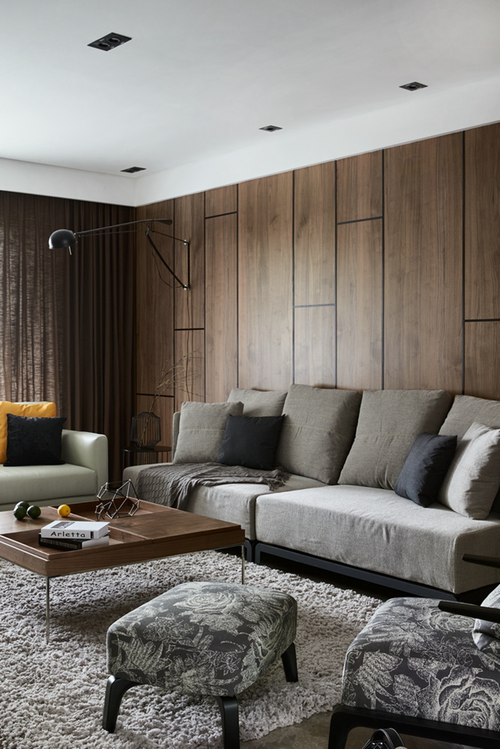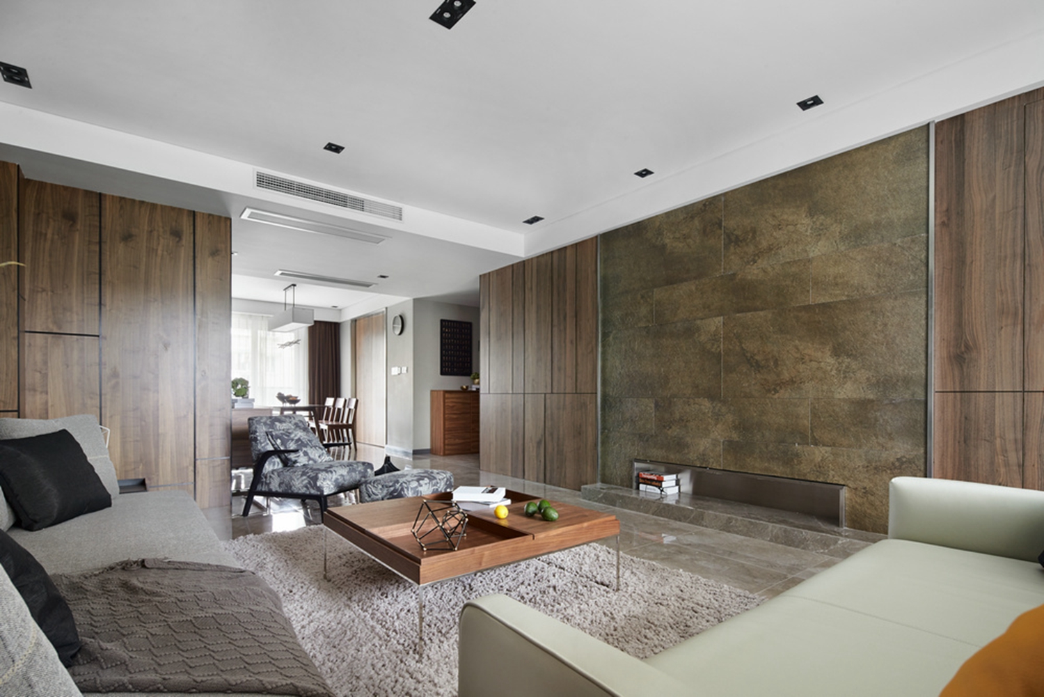 木色地板上墙,长短不一,宽度不一,使空间简约却不简单,也更有质感。