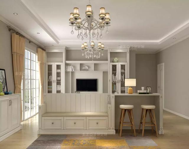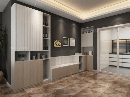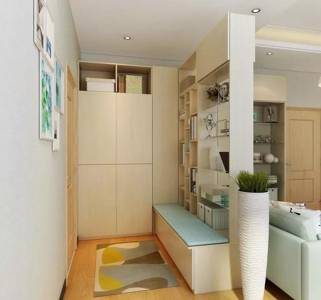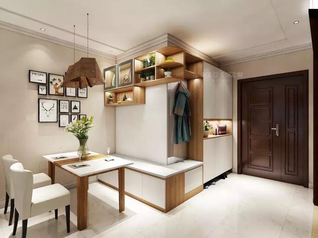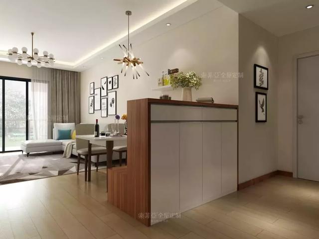 进门正对着客厅,做一个卡座隔断入户柜,这样可以实现空间共用还分化出了不同的区域。