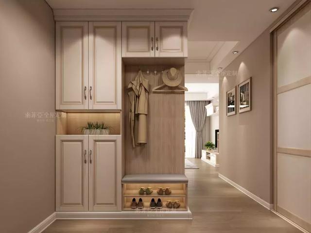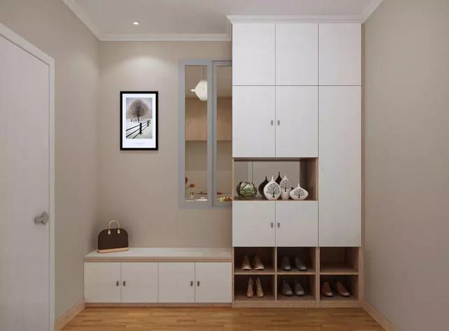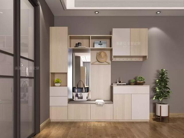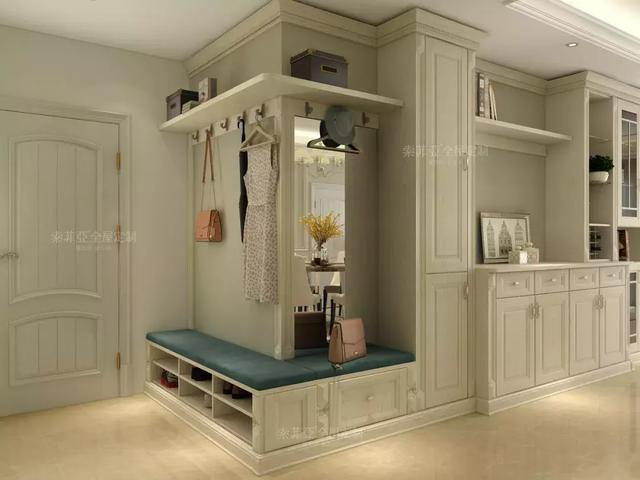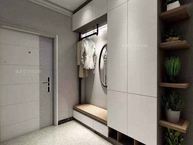 入户柜可以添加卡座设计充当换鞋凳,方便换鞋和随手放包包、杂货。对于收纳来说,要想用来放常穿鞋,建议打造成隔板,拿放方便。