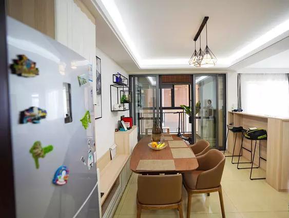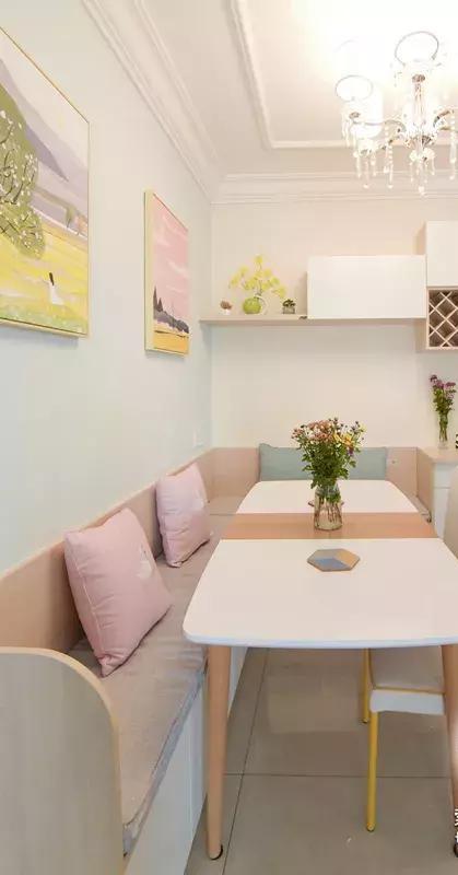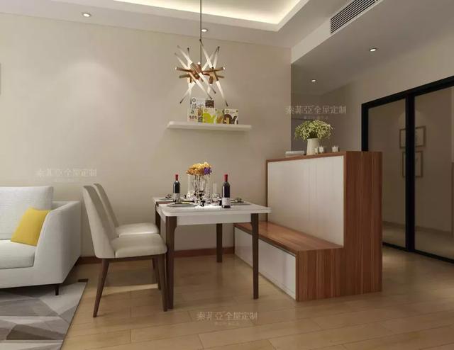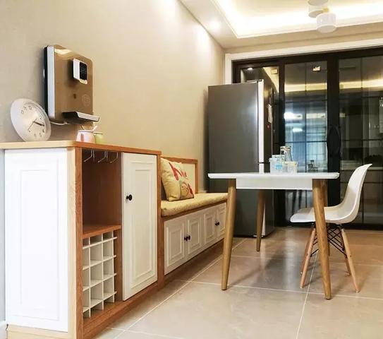 进门就是餐厅的户型,把卡座打造成隔断柜,靠门边的一面用来收纳鞋子,靠餐厅的一边当座位,这样的区域分隔,美观又实用。