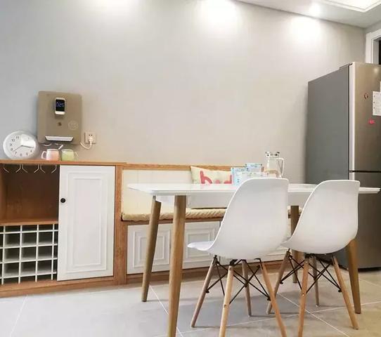 餐边柜+卡座,绕着墙贴边的设计,一面墙是卡座,一面墙是餐边柜,这样即可以收纳更多物品,而且真的可以坐很多人。