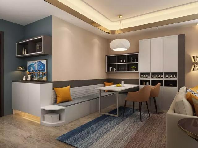 小户型的客厅,本身空间不算宽敞,靠墙设计一整排卡座,可以坐下更多人,朋友来了再也不用挤沙发,一般,不过这种紧凑的设计会比较适合家里人比较少或者独居的家庭。