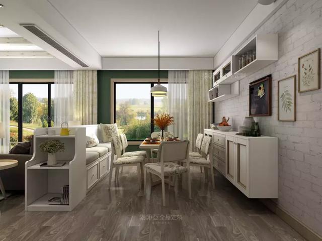 如果家里是开放式厨房,且客餐厅连在一起,可以在沙发背后做一个卡座餐椅,当作餐椅的同时形成空间隔断,这样在把区域分隔开的同时也不会很生硬。