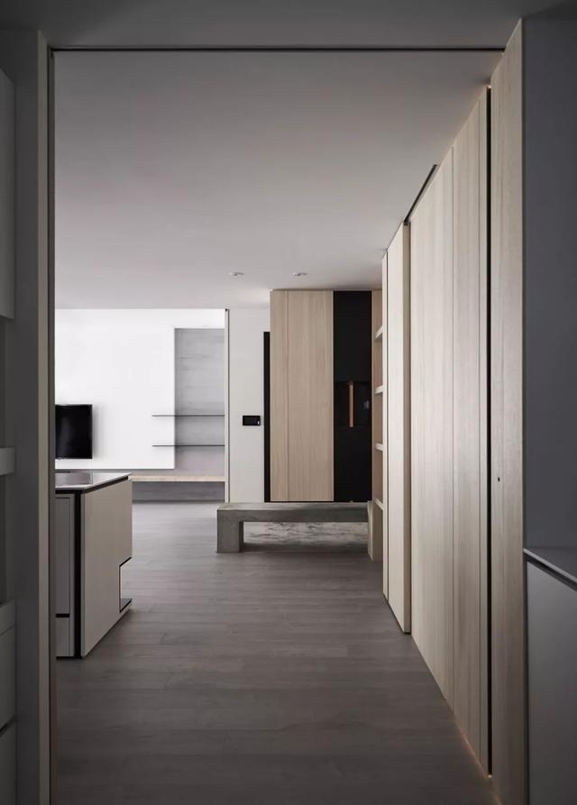 这套设计中玄关柜顶天立地,一直延伸到厨房。收纳满分的同时,柜体和墙面一体化,视觉上更加通透。利用试鞋凳做隔断,不挡光线,一目了然,美观实用两不误!