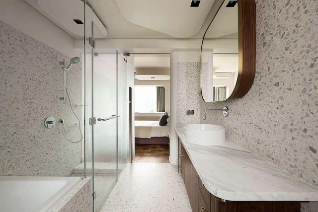 拉开磨砂玻璃推拉门,步入到干湿分离的卫浴室中。整洁、干爽的空间带来极佳的舒适感。
