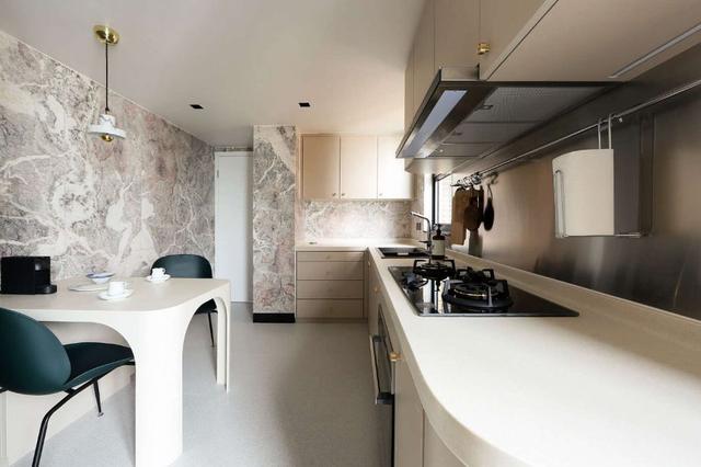 顺着墙体动线,安装定制橱柜,增大收纳空间,将那些瓶瓶罐罐的调料、锅碗瓢盆都藏起来,保持空间整洁。