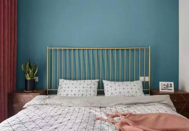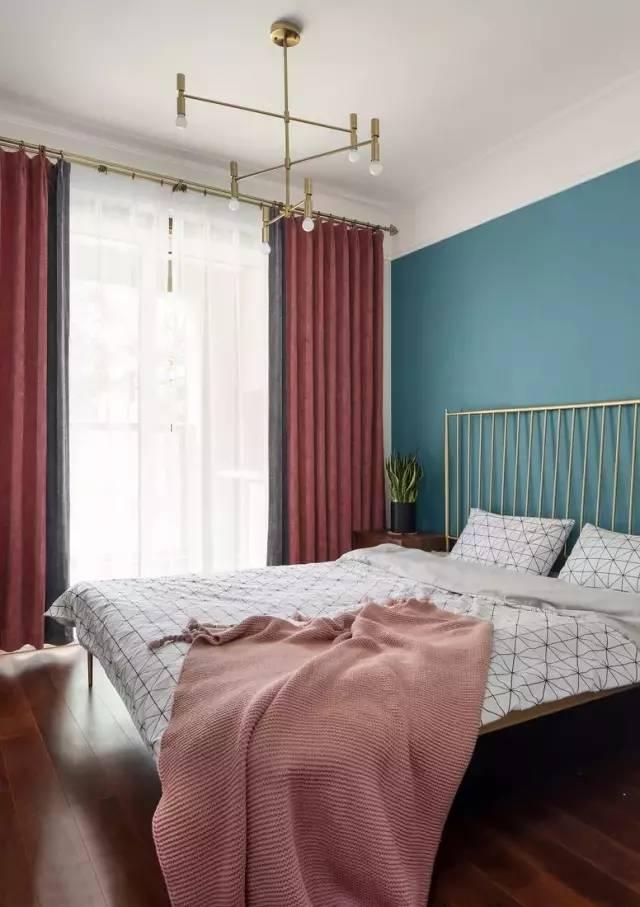 主卧采用了复古绿的主色调,加入了红色与少许灰色拼接的窗帘,为空间增添了一份细腻与浪漫。