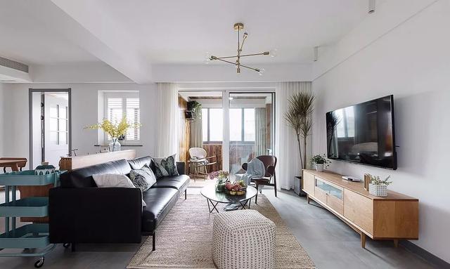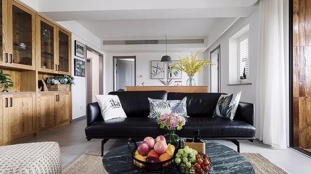 ▲ 黑色皮质沙发压住气场,与周围的原木色搭配,形成一种别样的美感。
