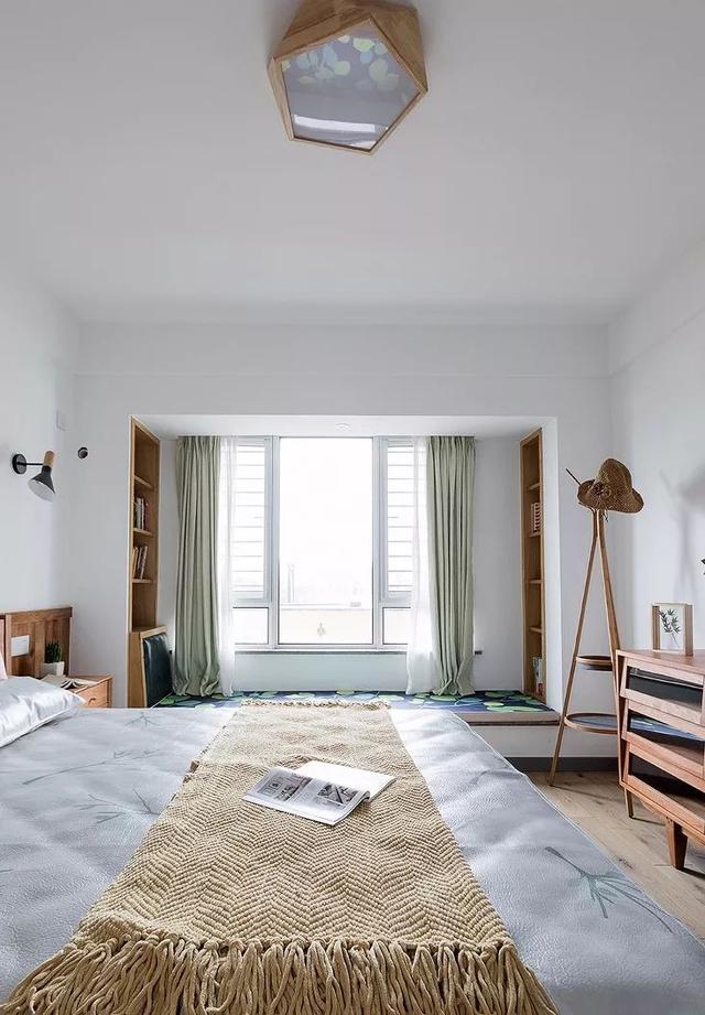 ▲ 飘窗的两边打了两个小书柜,方便收纳与展示。左侧设计了一个靠背,方便靠在飘窗上阅读、休息。