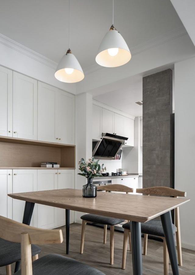 餐厅与客厅相连,厨房采用玻璃推拉门的设计,将室外光引入了餐厅以及客厅。