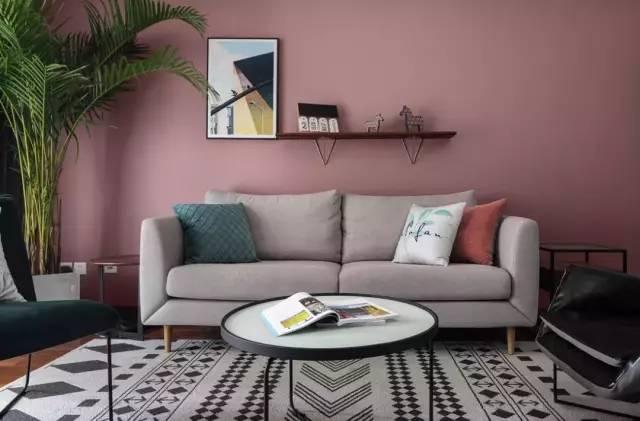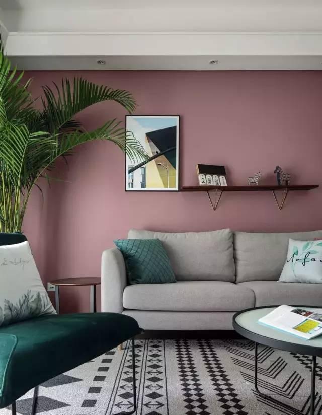 地毯采用了灰白色几何图案,增强了空间层次感。沙发背景墙采用了烟粉色,适应目前的流行趋势,有一种高级感。搭配简约的布艺沙发,充满格调。
