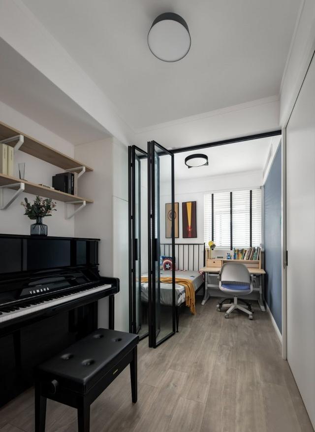 ▲ 内厅放置了钢琴,与儿童房之间以玻璃折叠门相隔,保证采光与通透性的同时,也能作为独立空间使用。