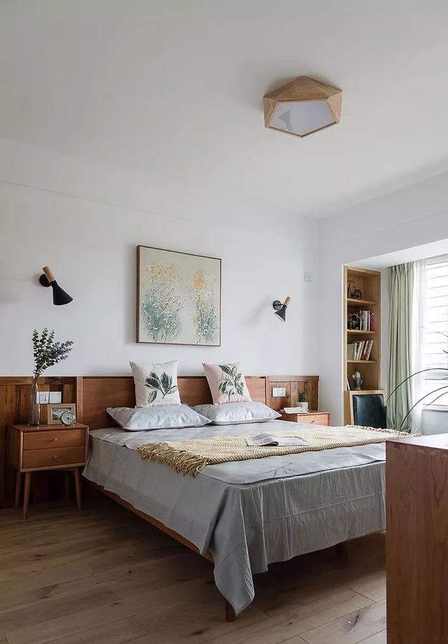 ▲ 主卧大面积的木色与白色搭配,简约自然。空间多处采用绿植进行点缀,生机满满。
