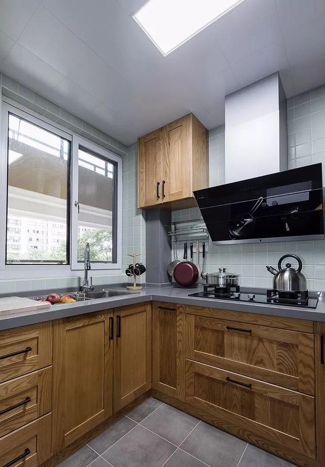 ▲ 厨房延续整体的风格,灰色台面和柜门都是网上订的,薄荷绿的小砖增添一抹清新的味道。