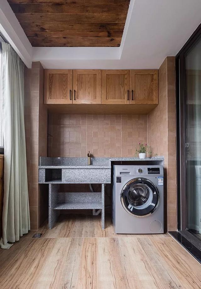 ▲ 定制的花岗岩洗衣池,上面一排木工打的柜子可以放洗衣用品。