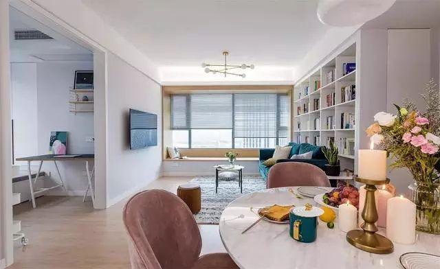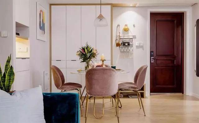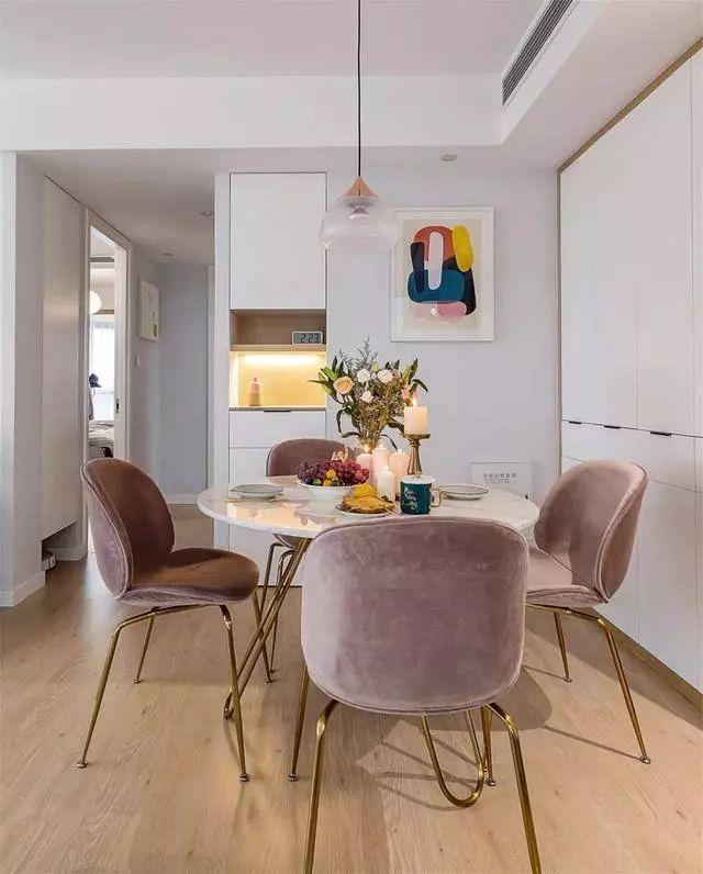 整体空间格局上更加适合圆桌,屋主比较好客,经常有客人拜访,圆桌更加方便增加位置招待客人,一群人围在一起吃火锅超级有氛围!大理石桌面的圆桌搭配着粉色丝绒餐椅不经意间流露出了轻奢的氛围。