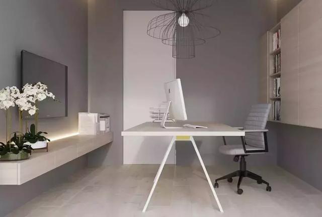 为了让主人能够静下心来读书、工作,书房整体选用平和的灰色与原木色调,顶部造型独特的吊灯,凸显出优雅的艺术气息。