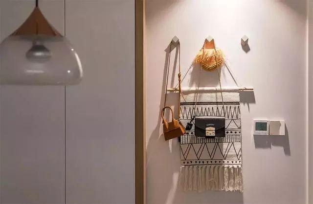 墙面的挂钩可以挂一些衣服和包包。因为屋主不怎么使用可视,又觉得在墙面上有些突兀,就利用挂毯遮挡,美观大方!