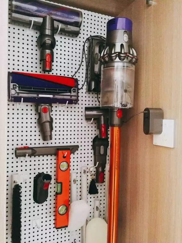 5. 在家中动线中心点的位置设置清洁柜。屋主自购洞洞板,将扫地机器人,吸尘器等清洁家电及家中辅助工具一起存储。减少清洁动线,让家务变轻松。