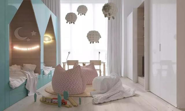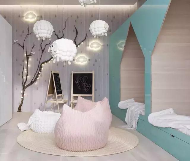 在充满爱与梦幻的房子里,孩子耳濡目染的美感,是给予他们最好启蒙。设计师采用柔和的蓝、灰色调,搭配墙面的树木造型,云朵的灯饰,绵羊的挂饰,给孩子营造出一个关于美的故事。