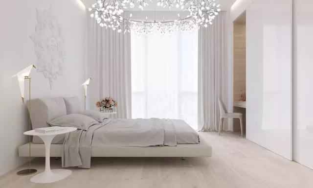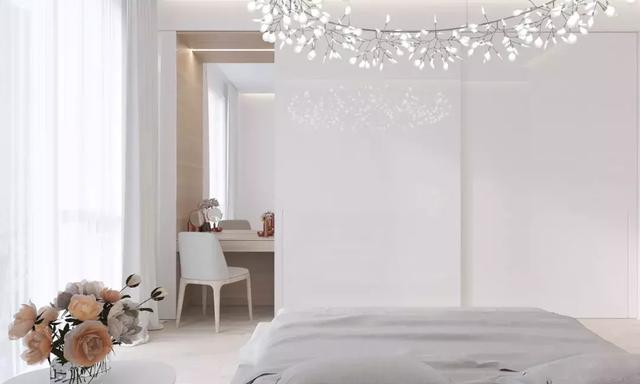 纯白的卧室,去除了生活中的繁杂,墙面石膏板雕花设计,为极简的空间带来优雅的情调。
