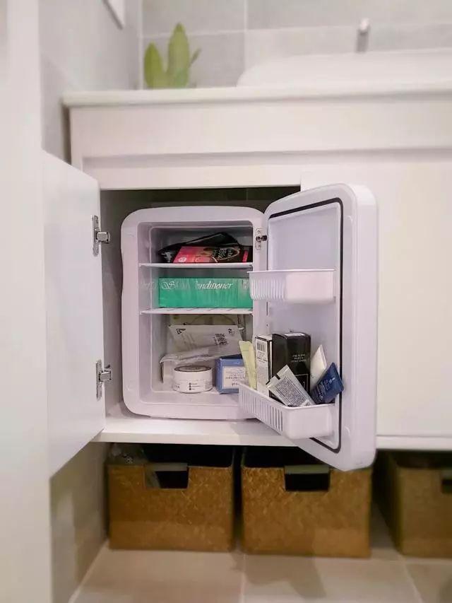关于面膜冰箱,设计师和屋主经过沟通,最后决定放在客卫的浴室柜里面,提前预留好了插座,这样屋主就可以放心大胆的买买买囤囤囤啦~