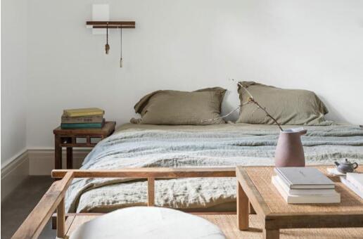 卧室也用了大量的木头,原木色配上灰色布料以及简单的矮床桌,简单又自然。