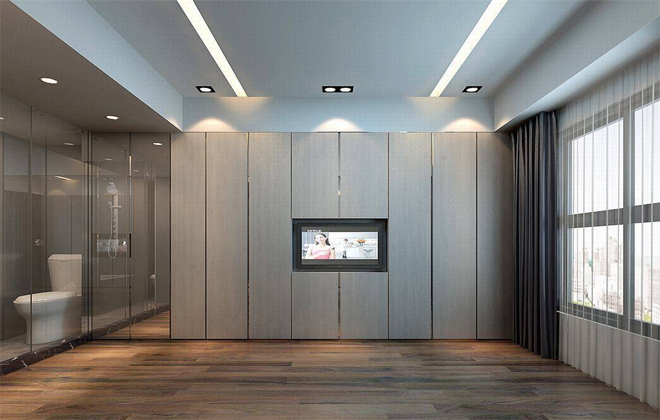 纵向的线条点缀门片增加质感,并将视听设备镶嵌其中,维持平整舒适的视觉效果。
