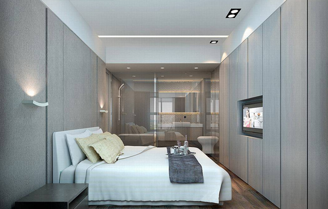 比照饭店设计,以全透明的卫浴隔间手法,完整延伸河岸景致与采光。