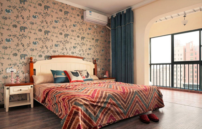 卧室的多彩柜与床和墙纸颜色相配,主卧空间立马沉静了下来。