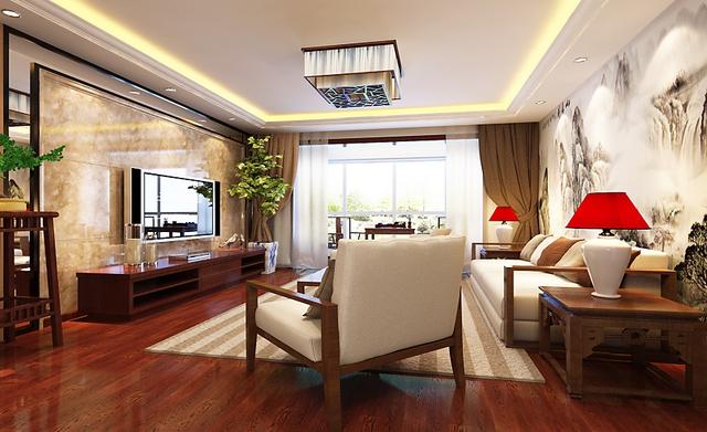 客厅为中式风格,典雅,富有文化气息,给人心灵的安静与厚重之感。棕色的地面犹如坚实的大地承载着华夏,而清亮的屋顶犹如九十九重天际一般白云朵朵。沙发背景墙面的中式水墨大作,更像是气势恢宏的无限山河!
