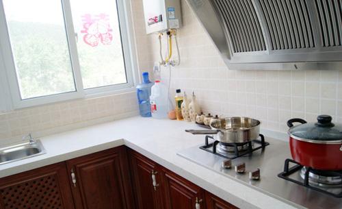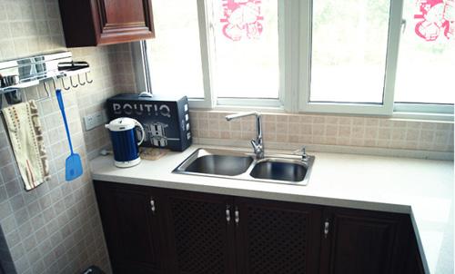 厨房属于7字形,橱柜的配色和材料都和餐桌统一,延续中式的味道。