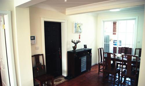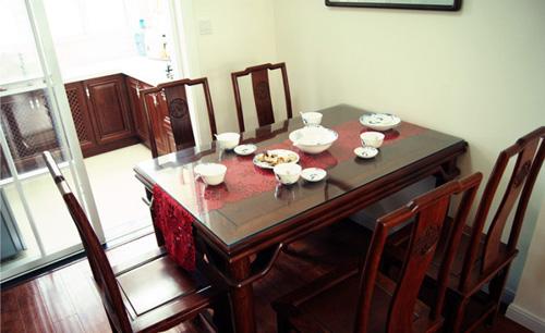 当时拍照片的时候,是刚吃完饭,当做运动。上图特地让老婆不要把餐具收掉,让餐厅有生活感。餐桌是特地配合中式风格买的,其实真的不够,不过挺上档次的。
