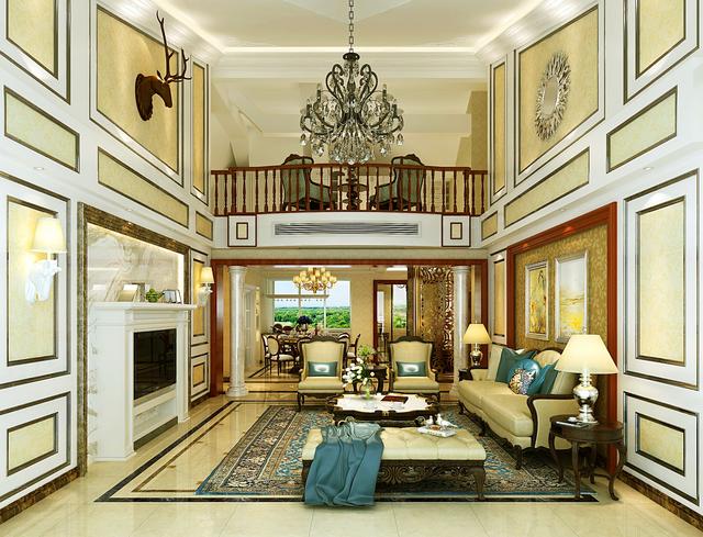 客厅空间的挑空设计同时辅助以木质线条的造型将整体空间设计的恢弘大气。