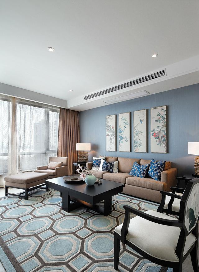 在进门的右边就是客厅的位置,这个空间是通往阳台的门,整体客厅给人的感觉是四四方方的很端正的感觉,采用了蓝色线状墙布,搭配上黑色茶几、咖色沙发和窗帘,蓝色系的地毯,色调稳重而大方。插一句吊顶的花式,非常简洁、大方,更显宽敞。