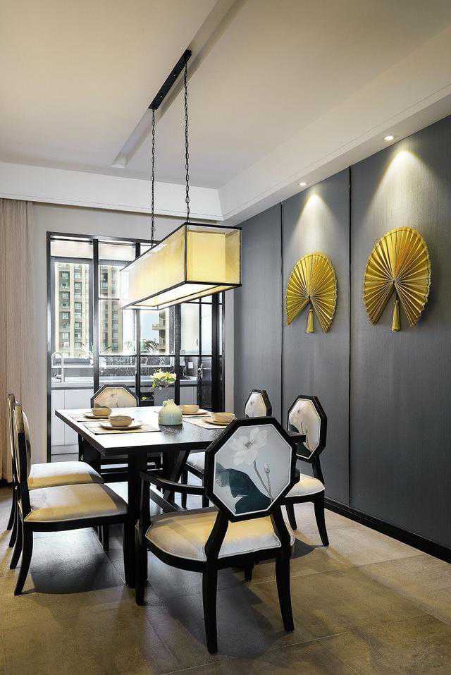 这个餐厅的墙面采用的是和客厅背景墙一样的,而中间用到了不锈钢金属细线条做了一个隔断的处理,让这个墙看起来有特色不呆板。在搭配上装饰扇,与餐灯鹅黄的调调很搭。餐厅与厨房间选用了黑色玻璃移门,做了两者间很好的隔断,又不影响通风和采光。