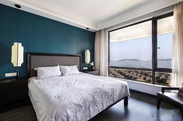 可以看到这个卧室看起来简洁大方,只摆了一张大床和两个床头柜,没有设计电视柜,而在卧室色彩上设计的又很有特别,主卧选择深蓝色,带点绿,在另一个次卧则是选了深红色作为背景色,家具一色的深栗色或黑色。