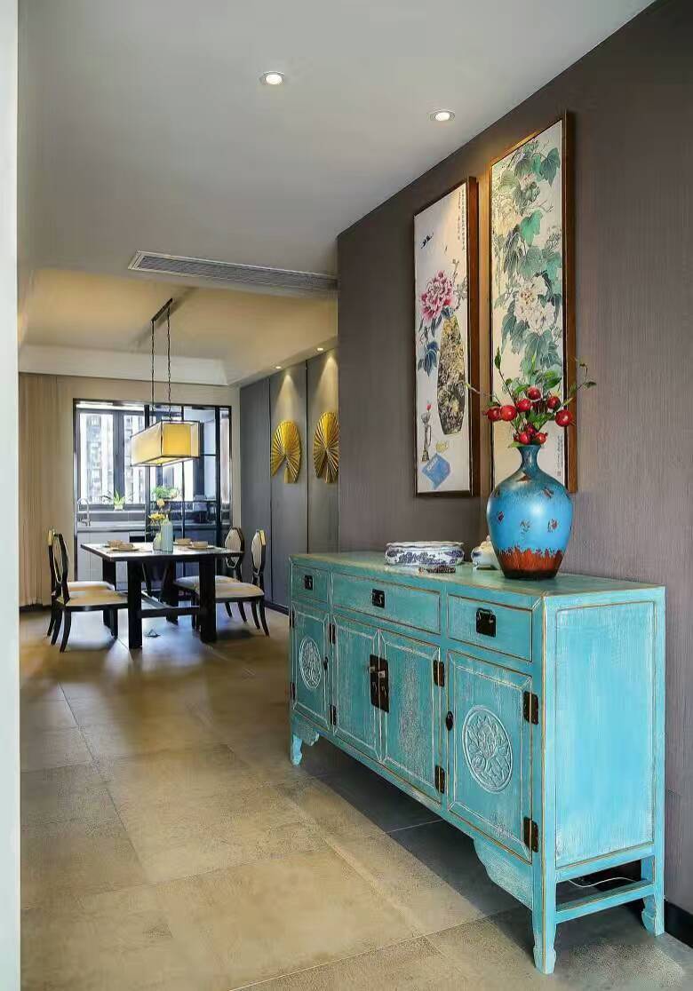 进门玄关处,这堵墙是没有办法敲掉,所以就将它作为了玄关迎面墙,因为是和餐厅客厅在同一个平面上,这样的设计也是起到了一个很好的视觉隔断。让连着客厅电视机的那整面墙看起来不是那么长。选了用到的咖色线状墙布,配了个亮丽的蓝色中式储物柜,加上两幅中式画,整个搭配让人进门眼前一亮。