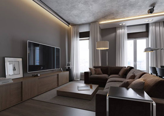 编辑点评:透明玻璃落地窗配上垂地式白色窗帘,不仅增加空间的采光率,还与整体空间的灰色色调相和谐。复式吊顶回光灯槽在视觉上扩大了空间,达到辅助光线的作用,又给空间增添神秘浪漫感和层次感。