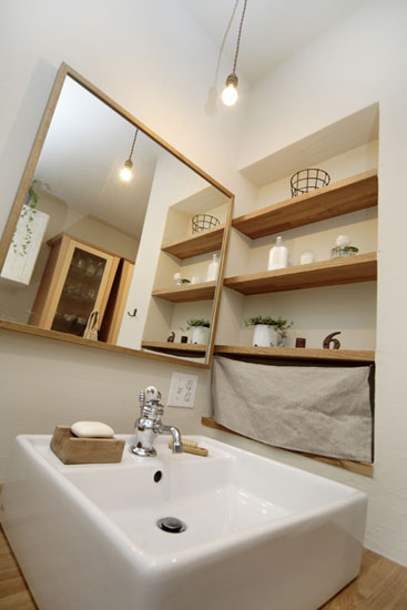 装饰Tips:洗漱池处,白色正方形的水池,凸显在木质洗漱台上,两种淳朴色彩的搭配,令洗漱间里更充满了淡雅的日式气息。模板分层打造的小空间,分层摆放上各种洗漱用品,不仅整洁大方,而且非常实用。白色的布帘遮挡住下面一层,更显整齐大方之美。方方正正的镜子,镶嵌木质边框,更显生活的淳朴与简洁。