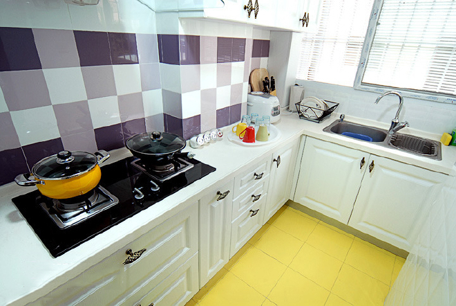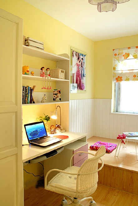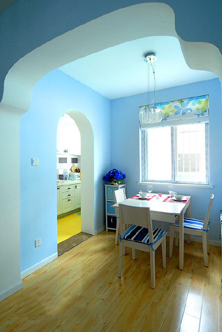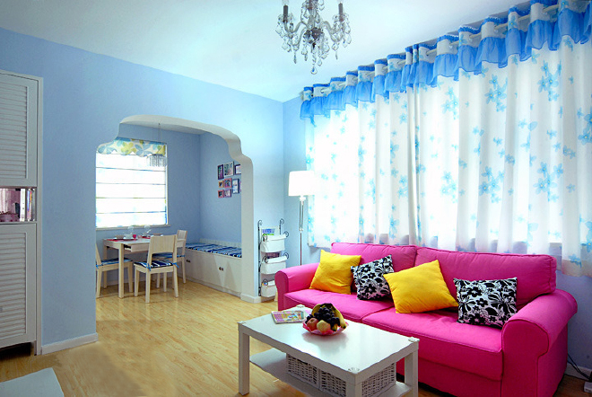 这是一个童话般的色彩家,很温暖很惬意。房间面积很小,但房主对色彩具有极高的敏感和迷恋。清爽的蓝色壁纸搭配粉色的布艺沙发还有柠檬黄的靠垫,色调搭配的鲜美宜人。漂亮的窗帘和屋子的整体色调融合起来。雅致的浅蓝色,柔和的光感仿佛置身于仙境一般。