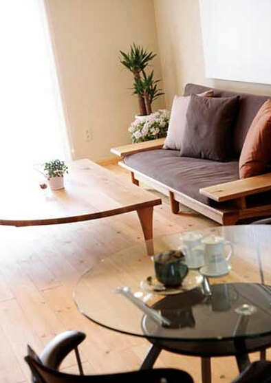 装修TIPS:半圆形的茶几,木纹清晰,给人温和之余不失素雅。茶几上的一瓶酒以及酒杯,体现出主人悠闲的生活情调。白色的小花,在绿叶的陪衬下,更显清新淡雅。